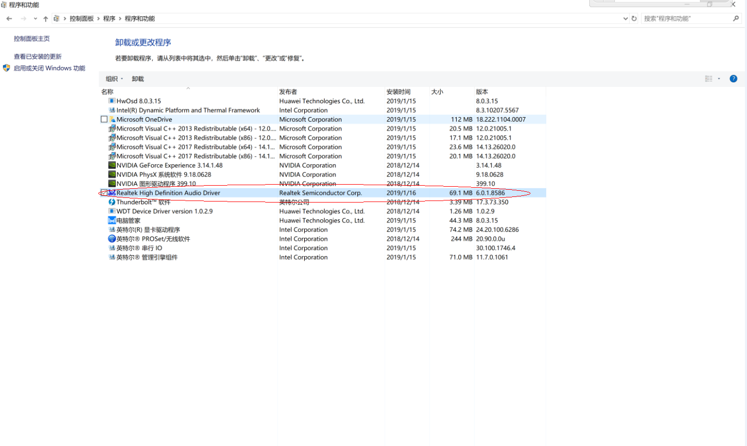 - 打开控制面板,找到Realtek High Defintion Audio Driver,双击卸载,等到卸载完成后重启电脑。