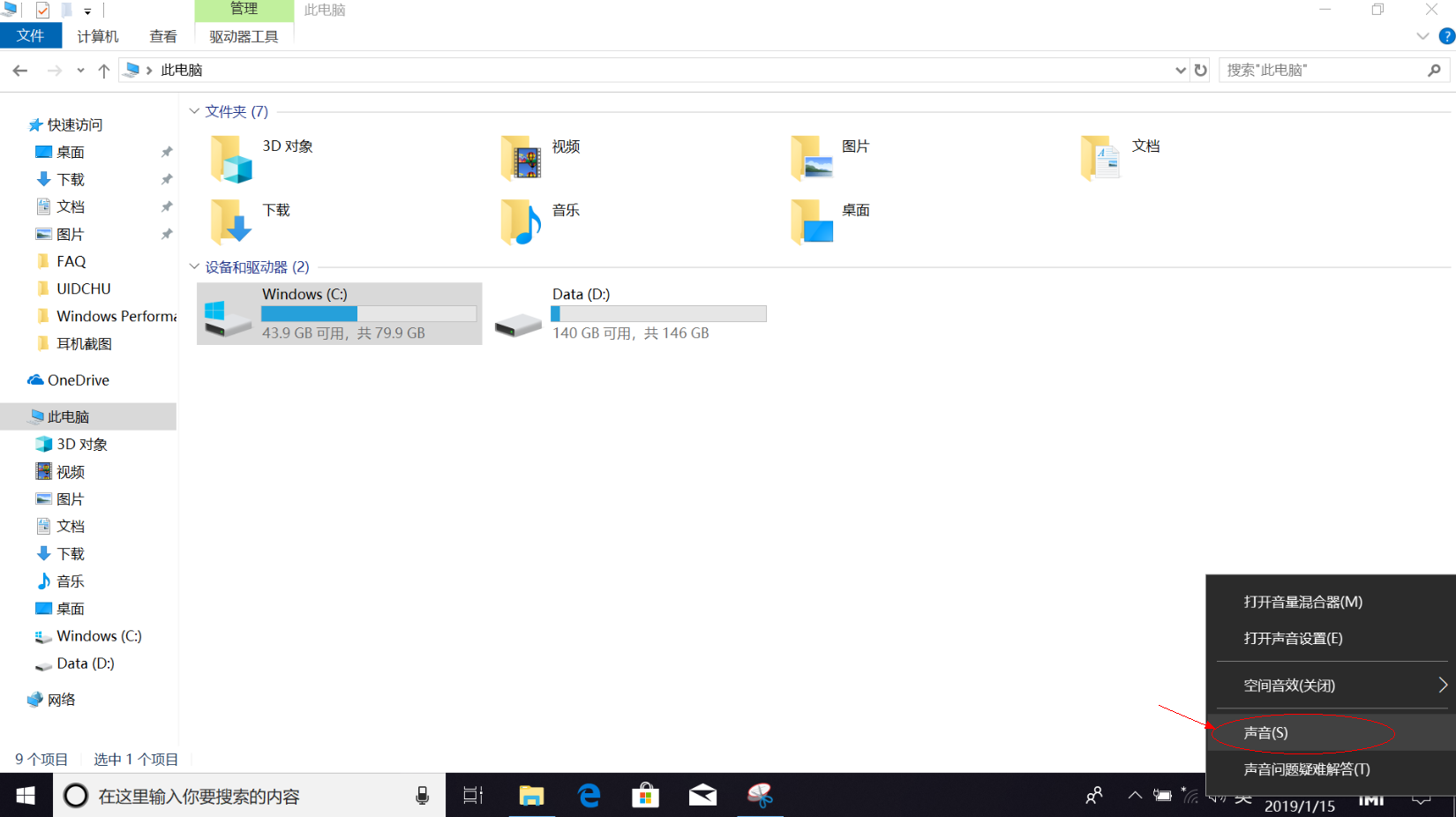 - 在任务栏的声音设置图标上点击右键,选择“声音”;