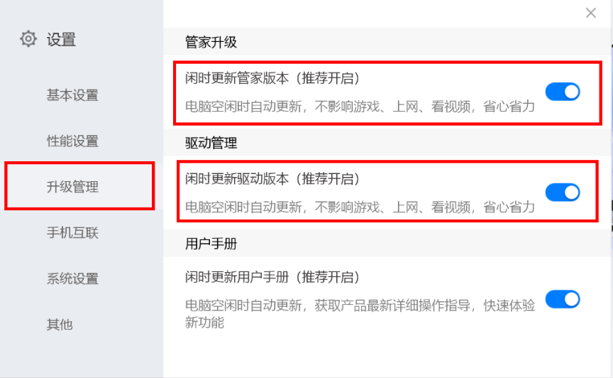 打开电脑管家,点击设置图标,选择“设置中心”,点击“升级管理”,打开闲时更新管家版本和闲时更新驱动版本的开关。