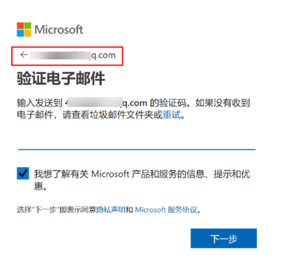 - 请您确保如下界面中显示微软帐户的邮箱地址是准确的,若您输入错误,请您返回后重新输入正确邮箱地址后再继续尝试注册并激活。