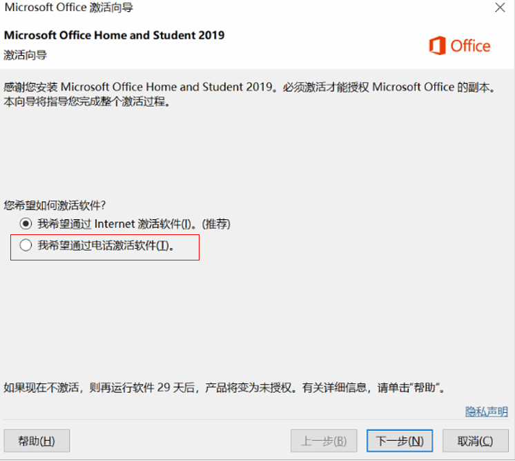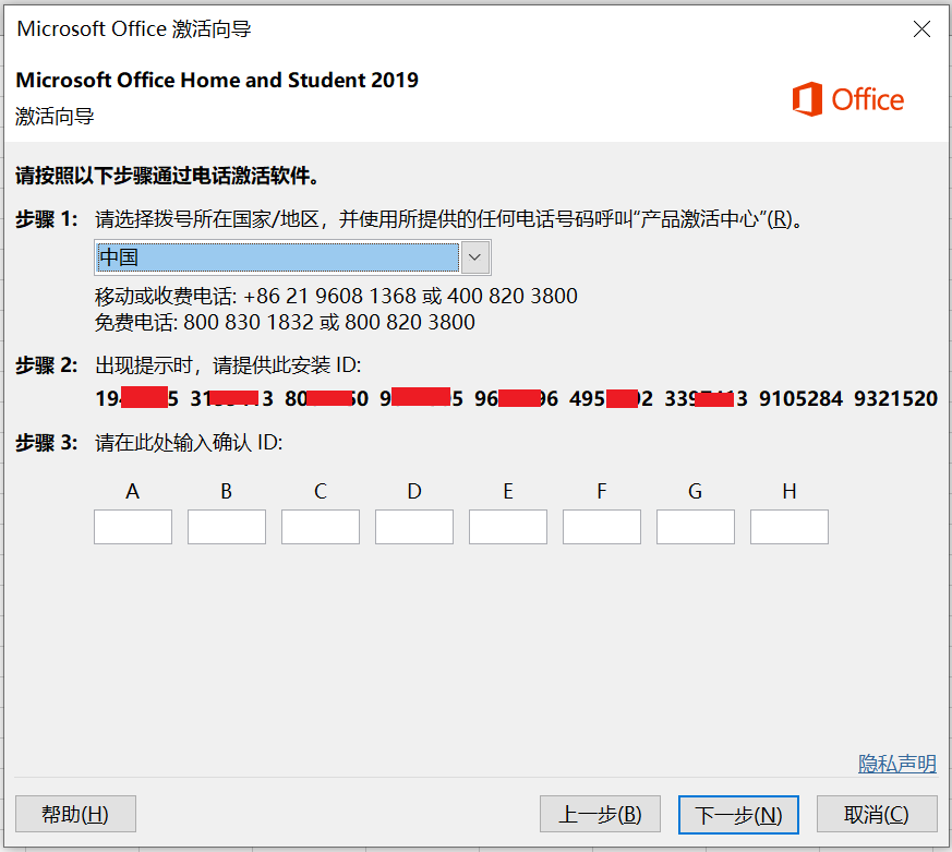 - 建议您提前准备好纸和笔,使用手机拨打界面上显示的激活热线,拨通后听语音提示依次拨5-1-2-2(微软电话语音菜单可能会有调整,请以微软最新语音提示为准),当听到“请输入安装ID”时,输入如上界面中的安装ID,语音会播报8组数字的确认ID,记录下来后输入到如上界面,点击“下一步”即可完成激活。