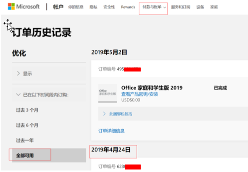 登录www.office.com/myaccount 在 付款与帐单 中查看购买历史记录,请务必在订单历史记录中选择全部可用(如下图中左下方红色框),再确认右侧是否有购买相同Office产品的订单记录。