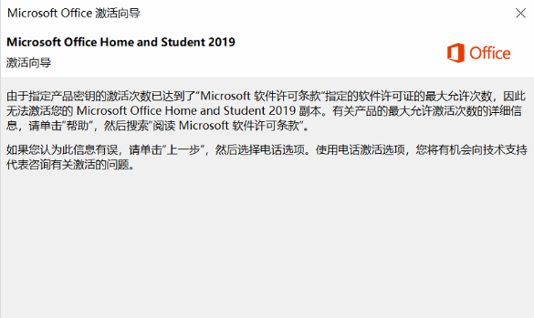 在激活预装Office家庭和学生版过程中,提示已达到软件许可证的最大允许次数,如下图。
