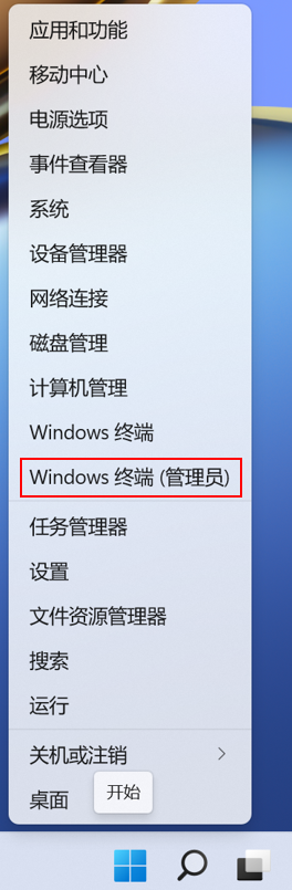 右键点击微软图标,选择“Windows 终端 (管理员)”(或在任务栏搜索“Windows PowerShell (管理员)”并打开)。在弹出的提示框“你要允许此应用对你的设备进行修改吗?”中选择“是”。
