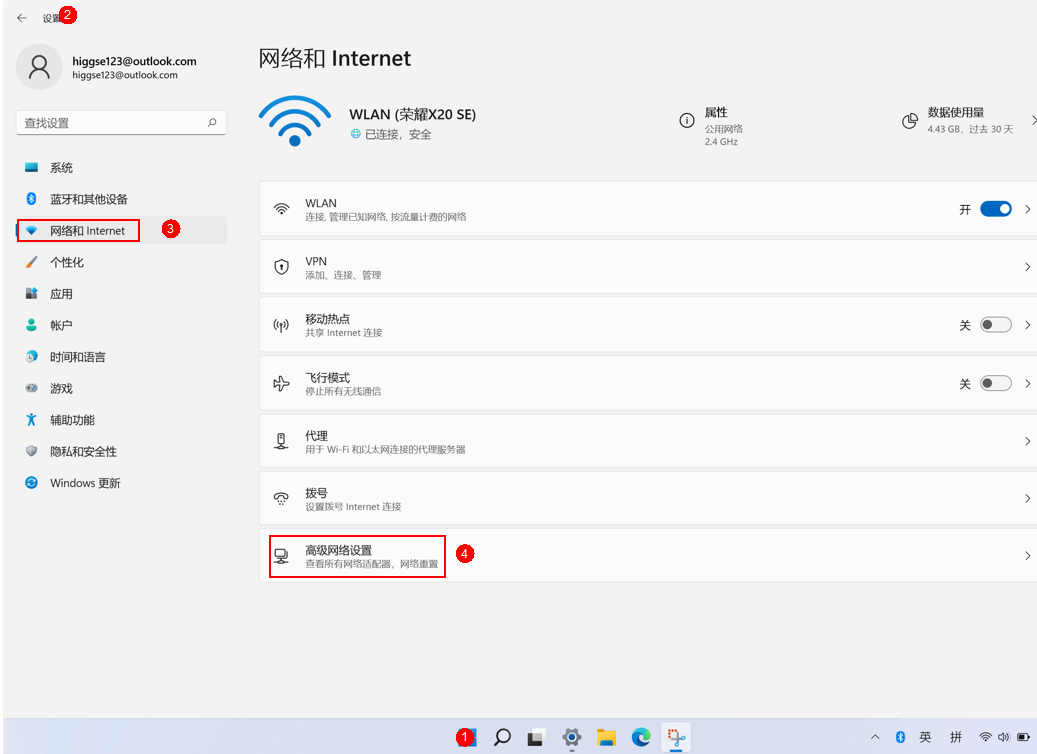 点击Windows 图标 > 设置图标 > “网络和Internet”,选择“高级网络设置”。