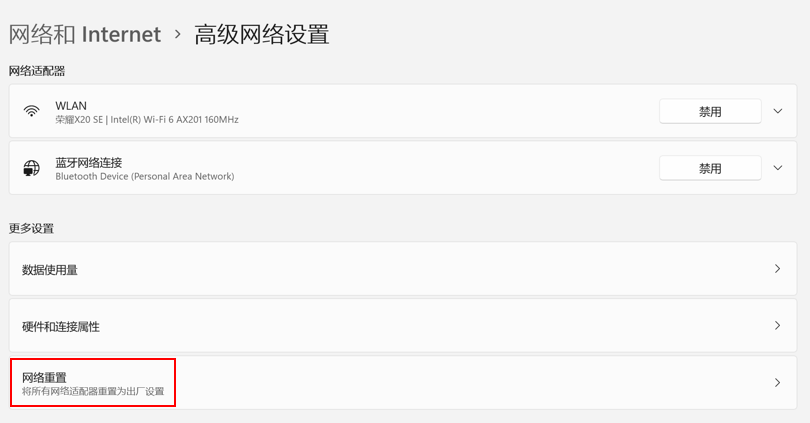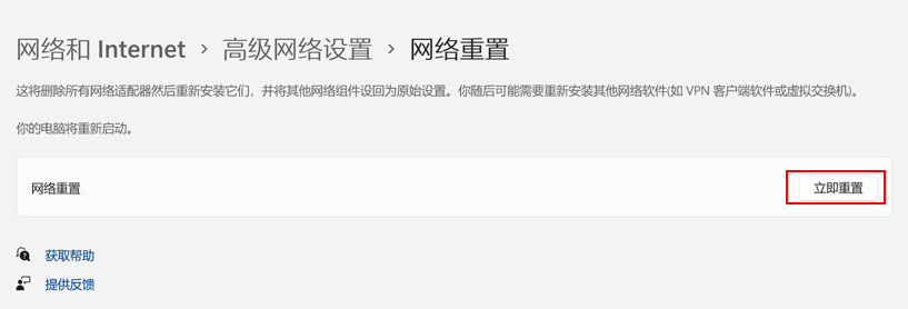 网络重置将删除所有网络适配器然后重新安装它们,并将其他网络组件设回为原始设置。重置后,您可能需要重新连接网络。