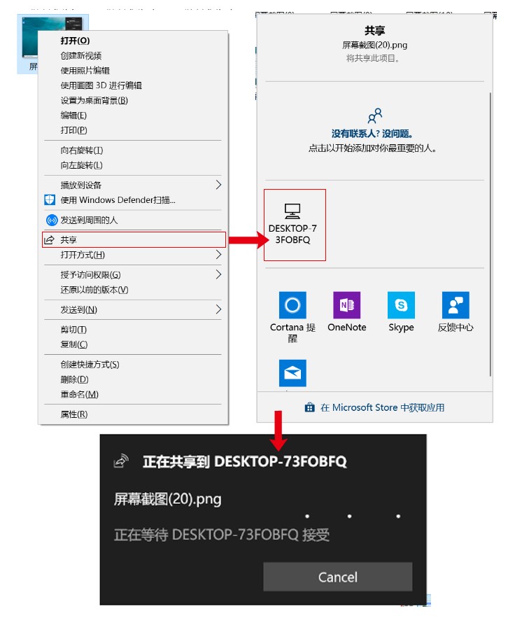- 找到要分享的文件,比如文档或者图片或者程序,右键点击该文件,选择共享,计算机会自动搜索附近有打开就近共享的计算机,选择待接收共享的计算机就可以分享,分享时,左面右下角会出现正在等待接收的界面。