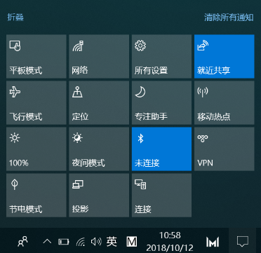 - 点击任务栏中的通知图标,然后打开就近共享图标和蓝牙图标,注意要发起共享的计算机和接收共享的计算机都需要打开。