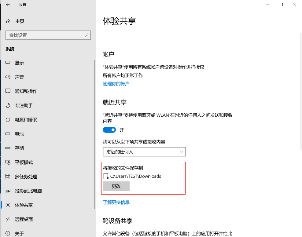 - 点击“体验共享”,可设置默认接收文件文件保存位置。