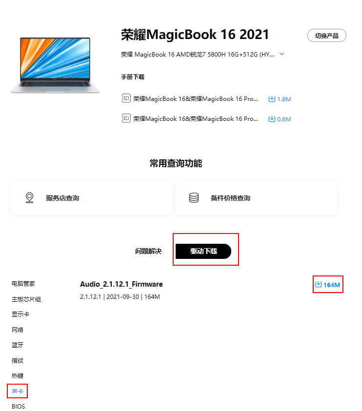 - 进入官网 https://www.honor.com/cn/support/,下载官网最新的音频驱动程序。