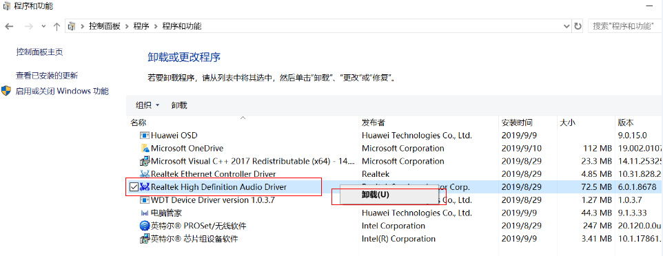 - 点击卸载程序,找到Realtek High Defintion Audio Driver,右键选择卸载。