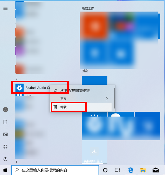 - 点击 Windows 图标,到 Realtek 的 UWP(Realtek Audio Console),右键选择“卸载”。