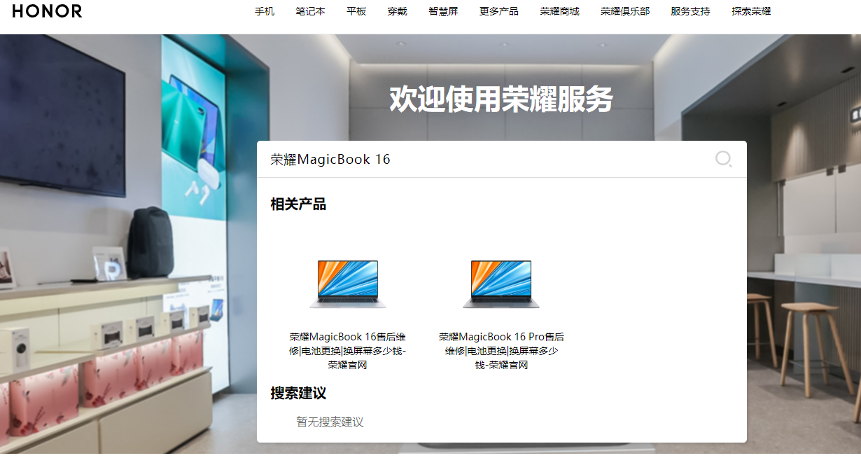 以下以 荣耀MagicBook 16 为例,进入官网后,在搜索列表中输入 荣耀MagicBook 16 并选择。