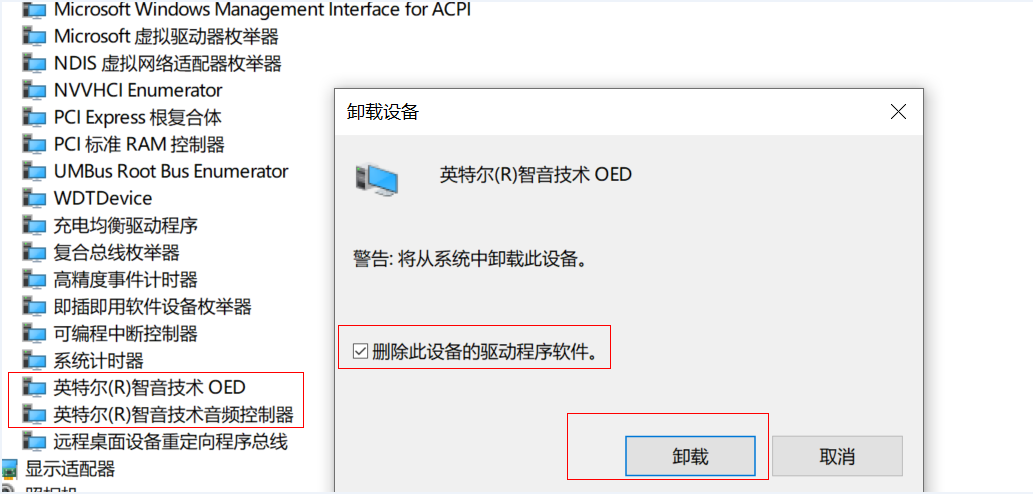 - 点击“系统设备”,然后分别右键点击 “英特尔智音技术OED”、“英特尔智音技术音频控制器”,选择“卸载设备”,勾选“删除此设备的驱动程序文件”后,点击“卸载”。