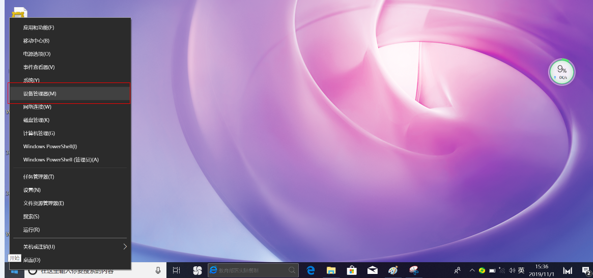 - 右键单击Windows 图标,选择设备管理器。