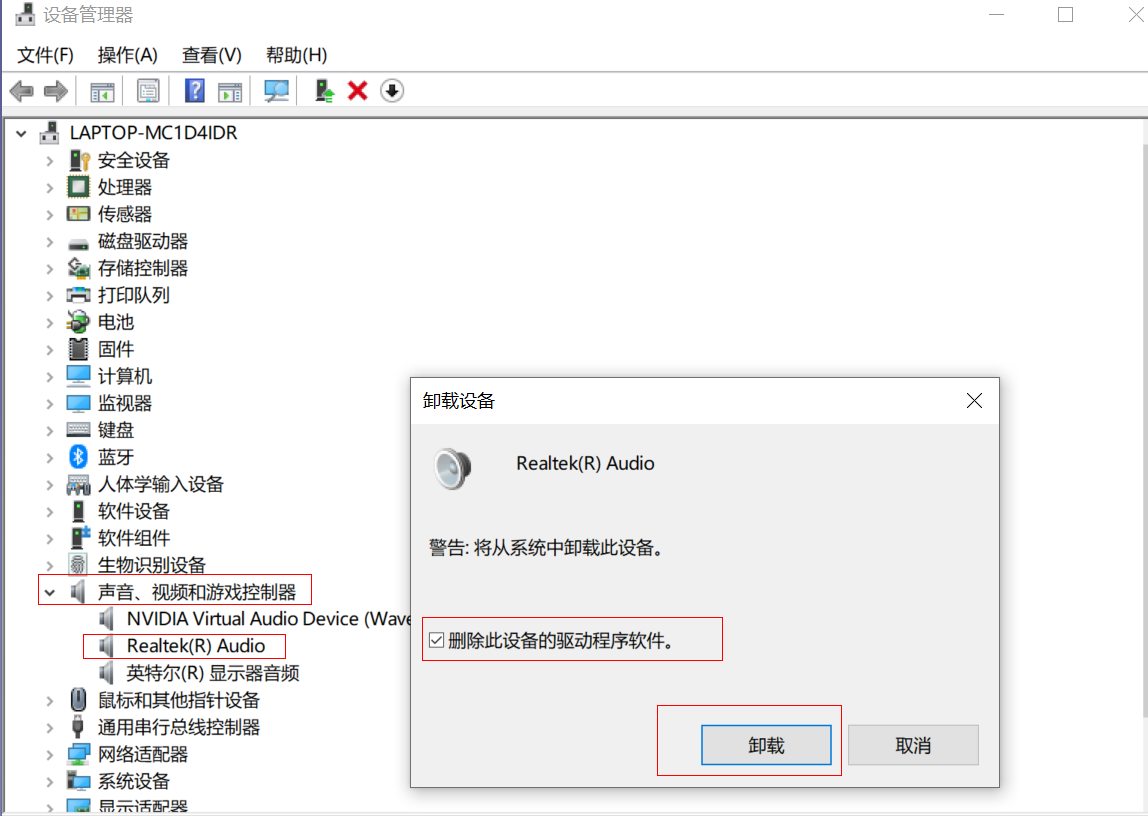 - 展开声音、视频和游戏控制器,右键单击Realtek Audio,选择卸载设备,勾选删除此设备的驱动程序文件,点击“卸载”。