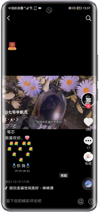 抖音视频文案展开区域无法滑动播放下一个视频,需要将展开的长文案折叠后才能滑动进入下一个视频播放。