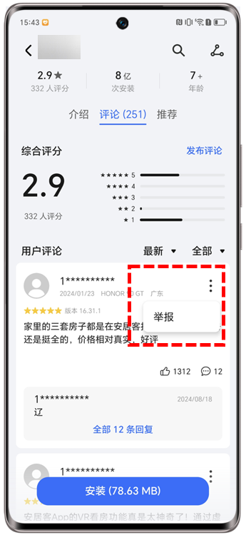 如需举报相关评论,点击评论右上角 >举报,即可举报/投诉荣耀应用市场的评论。
