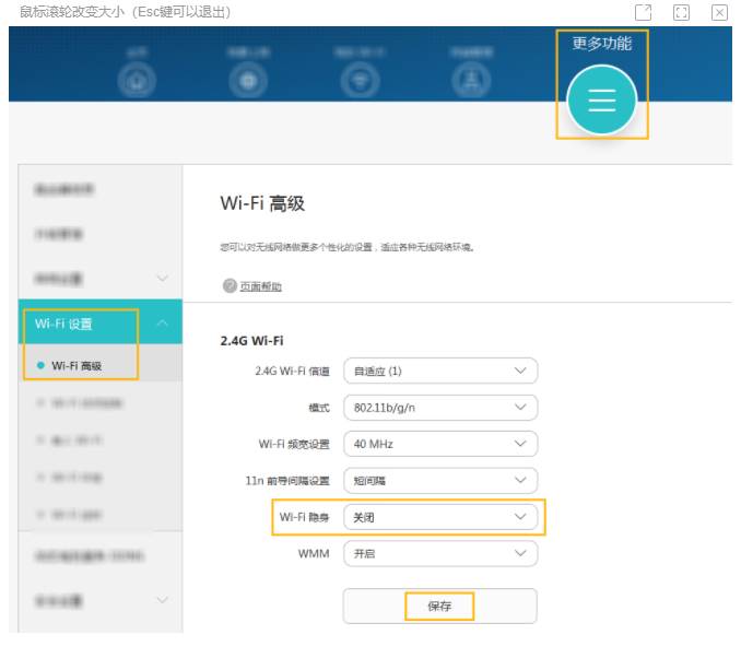 您可以登录路由器 Web 配置界面。进入更多功能 > Wi-Fi 设置 > Wi-Fi 高级。在 2.4G Wi-Fi 或 5G Wi-Fi 区域中,查看 Wi-Fi 隐身 开关均处于关闭状态(此处图片以 2.4G Wi-Fi 为例)。
