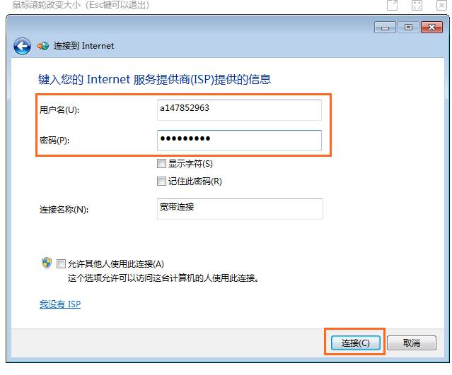 - 进入控制面板 > 网络和共享中心 > 设置新的连接或网络 > 连接到 Internet > 宽带(PPPoE) ,在用户名和密码中分别输入宽带服务商提供的宽带上网账号和密码。点击连接。