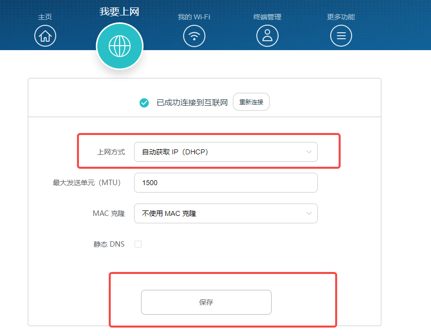 登录路由器 Web 配置界面。进入我要上网页面,查看路由器当前的上网方式是否和您的实际上网环境一致。若不一致,请手动修改后点击保存。