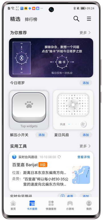 添加卡片:如需使用更多卡片,您可以点击右上角+ > 选点击心仪的服务卡 > 添加 ,即可添加卡片到负一屏(暂不支持添加到桌面)。后续我们将支持添加更多卡片,敬请关注。