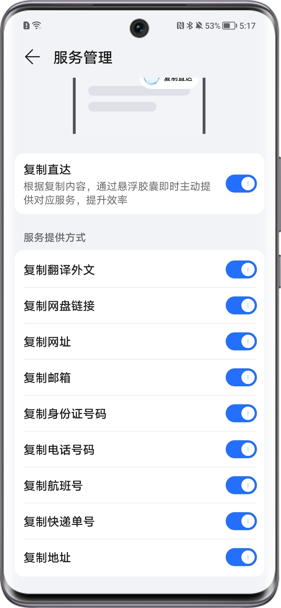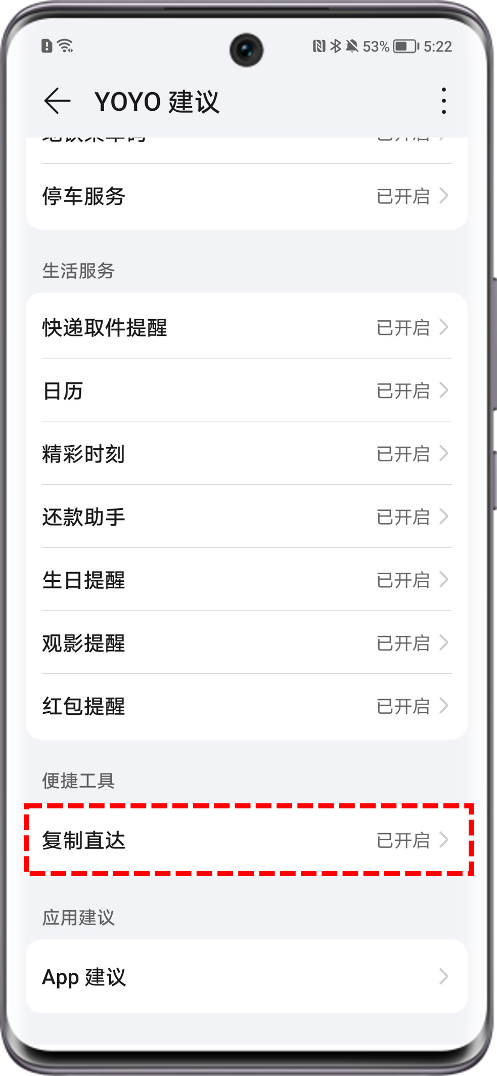 开启/关闭方法:在设置>智慧助手/荣耀AI&YOYO>YOYO建议>复制直达 中开启/关闭相关开关。