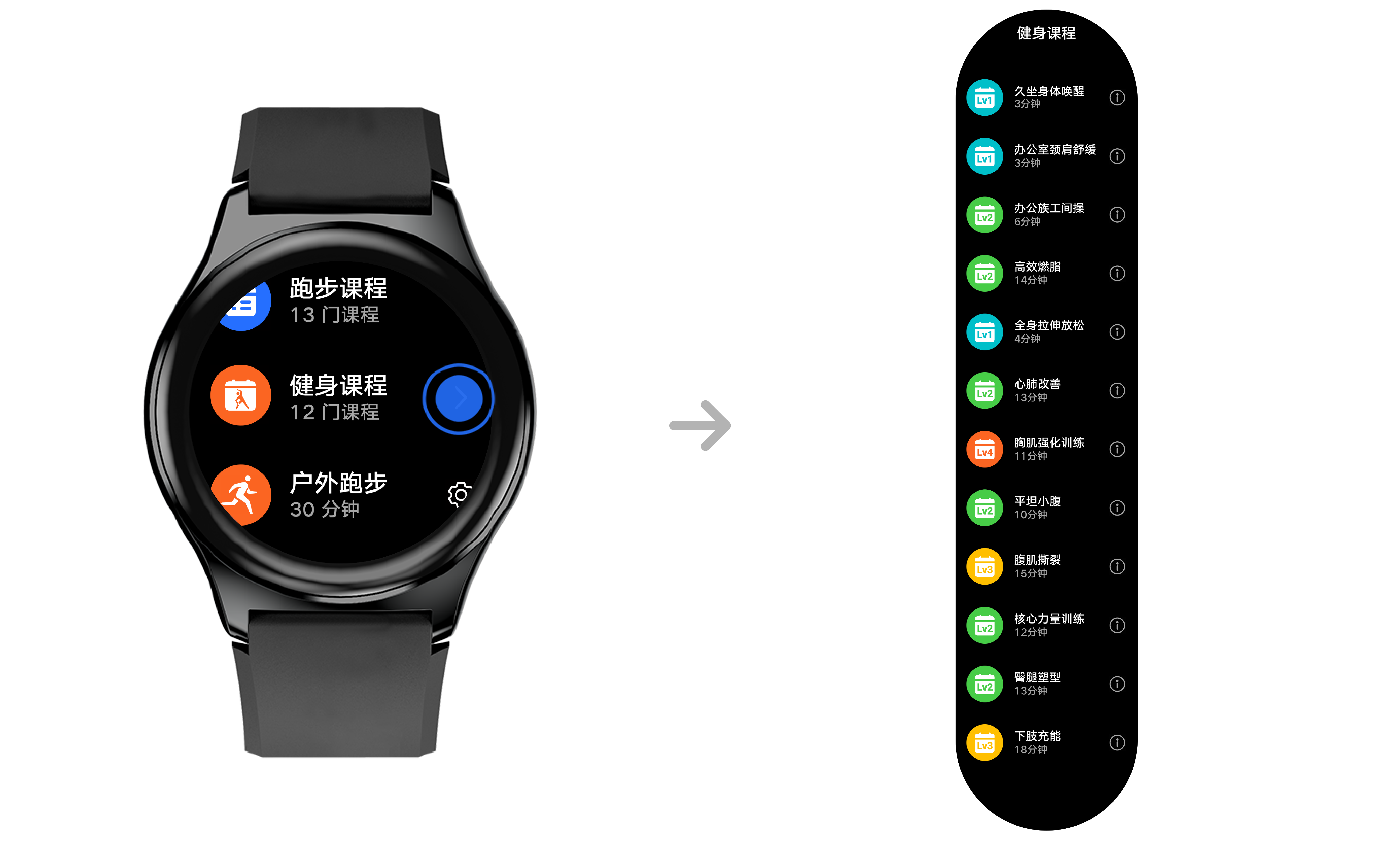 穿戴产品内置各项健身训练课程,更有私人教练式模拟动画全程指导。多种类的健身课程,全方面的科学训练、细致的语音指导助你轻松健身。
