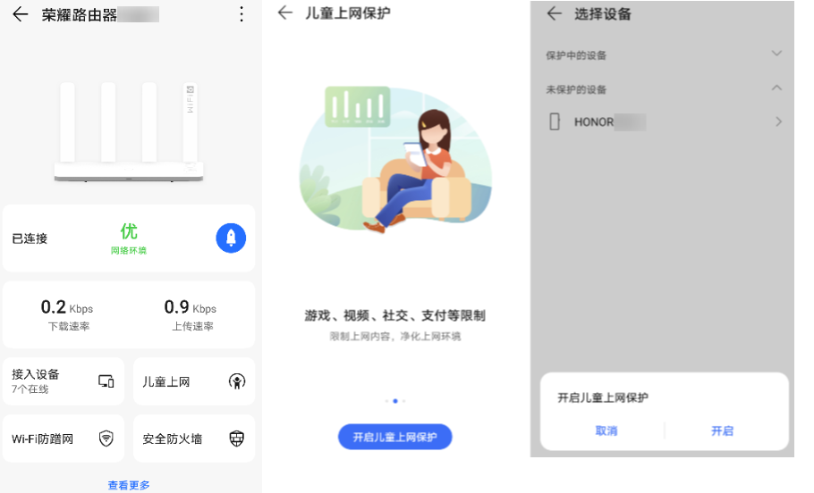 - 点击儿童上网,首次添加设备需根据提示点击开启儿童上网保护,然后在选择设备页选择需要保护的设备,点击开启。