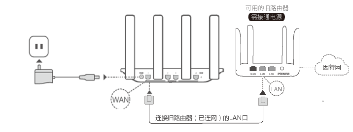 - 连接线缆:用网线将路由器的WAN/LAN 自适应网口连接到旧路由器的 LAN 接口。连接电源。