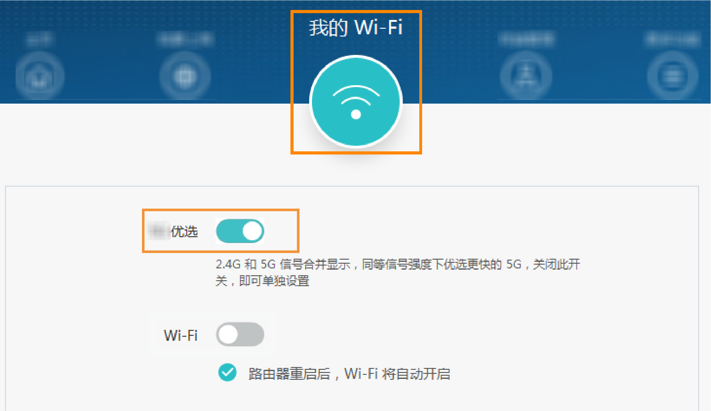 支持双频优选(或 5G 优选)功能的路由器 2.4GHz/5GHz Wi-Fi 名称默认相同,会自动为您连接更快的 Wi-Fi 信号。若您想要固定连接 2.4GHz 或 5GHz Wi-Fi,请关闭双频优选(或 5G 优选)功能。关闭后,您可以搜索到两个 Wi-Fi 名称(2.4GHz Wi-Fi 名称为“XXXXXX”,5GHz Wi-Fi 名称为“XXXXXX_5G ”),并根据需要连接对应的 Wi-Fi。