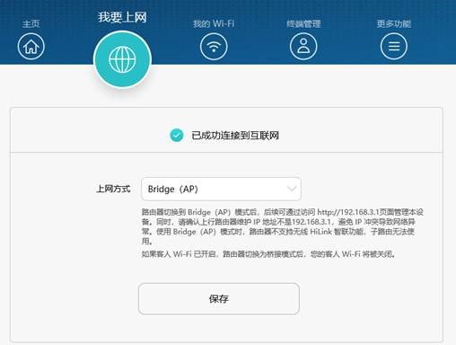 - 点击我要上网,在我要上网界面选择上网方式为桥接 Bridge(AP),点击保存,保存成功后,您可以根据需要在我的 Wi-Fi 页面修改 Wi-Fi 名称、密码等参数。