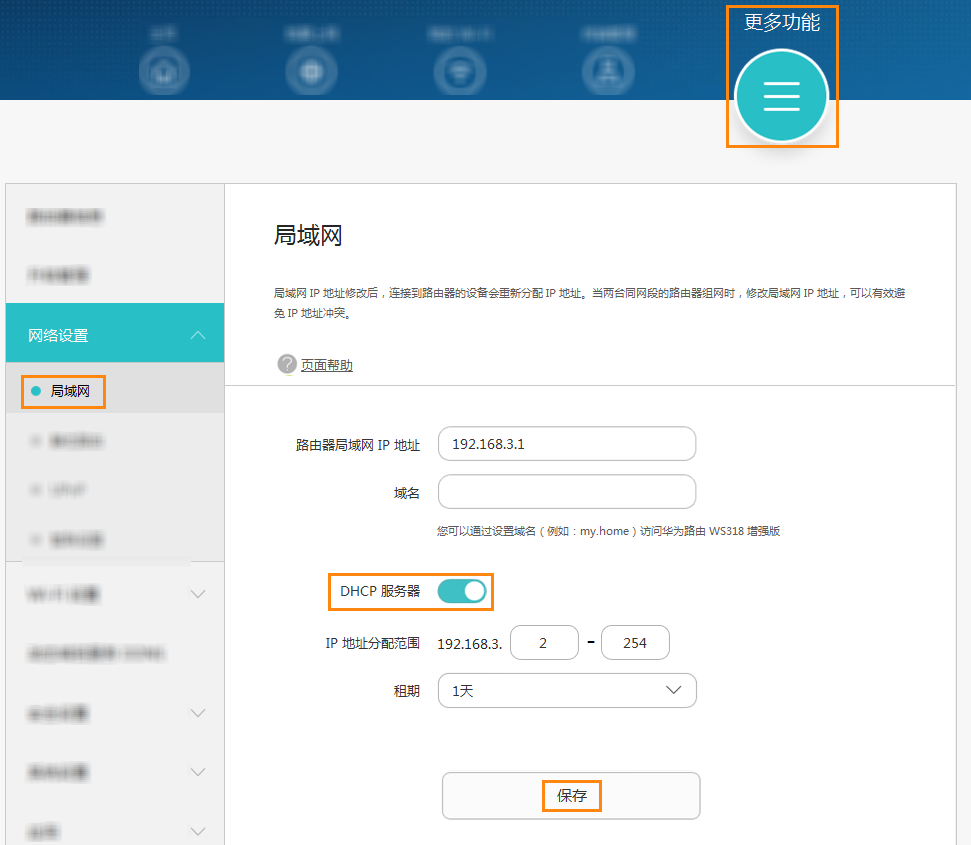 - 进入更多功能 > 网络设置 >局域网页面,关闭 DHCP 服务器开关。