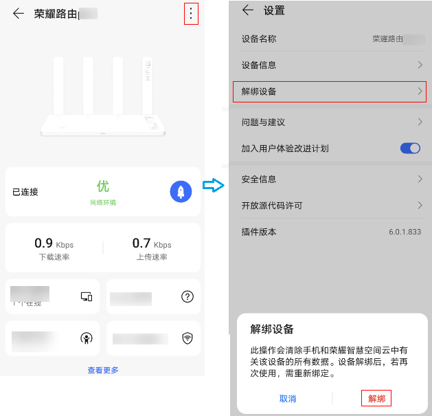 - 在荣耀智慧空间 App 中解绑路由器步骤如下:
