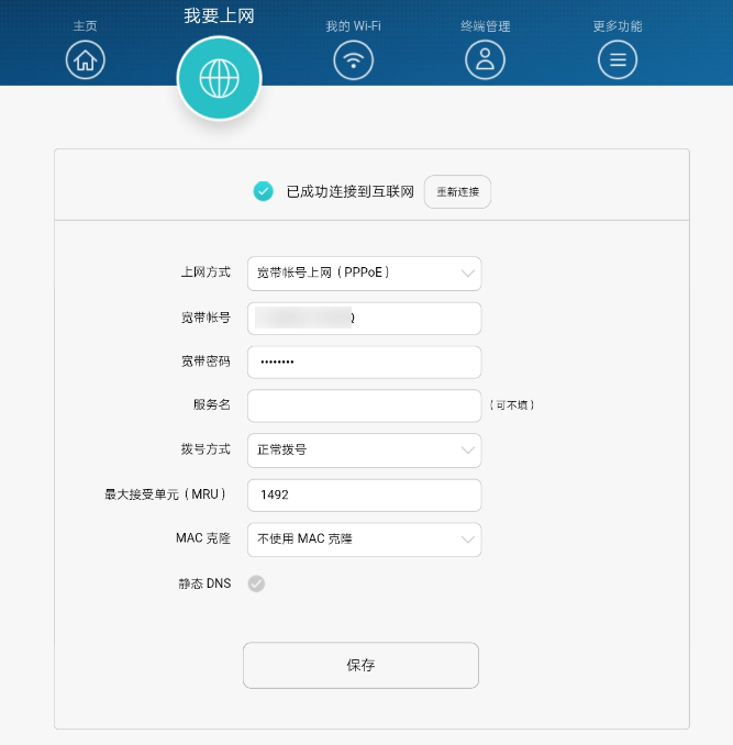 - 进入我要上网页面。在上网方式下拉框中,选择宽带账号上网(PPPoE),并手动填写宽带服务商提供给您的上网帐号和密码。点击保存。