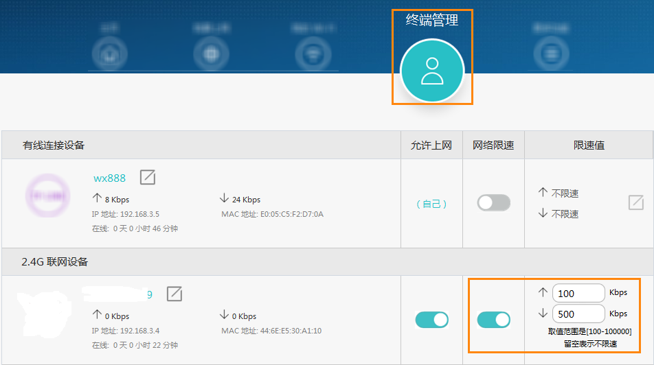 - 点击终端管理。找到您想要限速的手机或电脑。打开该终端的网络限速开关,点击“限速值”中的图标