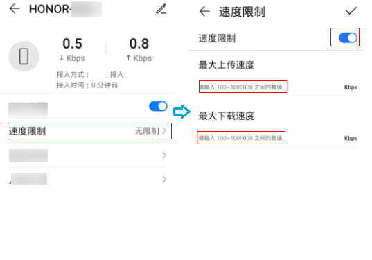 - 点击速度限制,打开速度限制开关,即可对此设备的最大上传速度和最大下载速度进行设置。