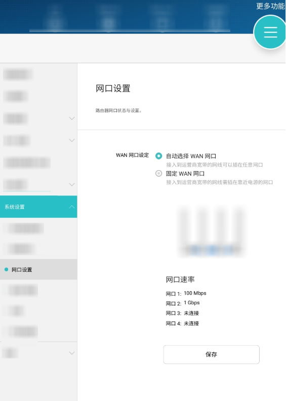 - 点击,在 WAN 网口设定区域中选择固定 WAN 网口,再点击保存即可关闭网口盲插功能。如果您想重新开启,选择自动选择 WAN 网口并点击保存即可。