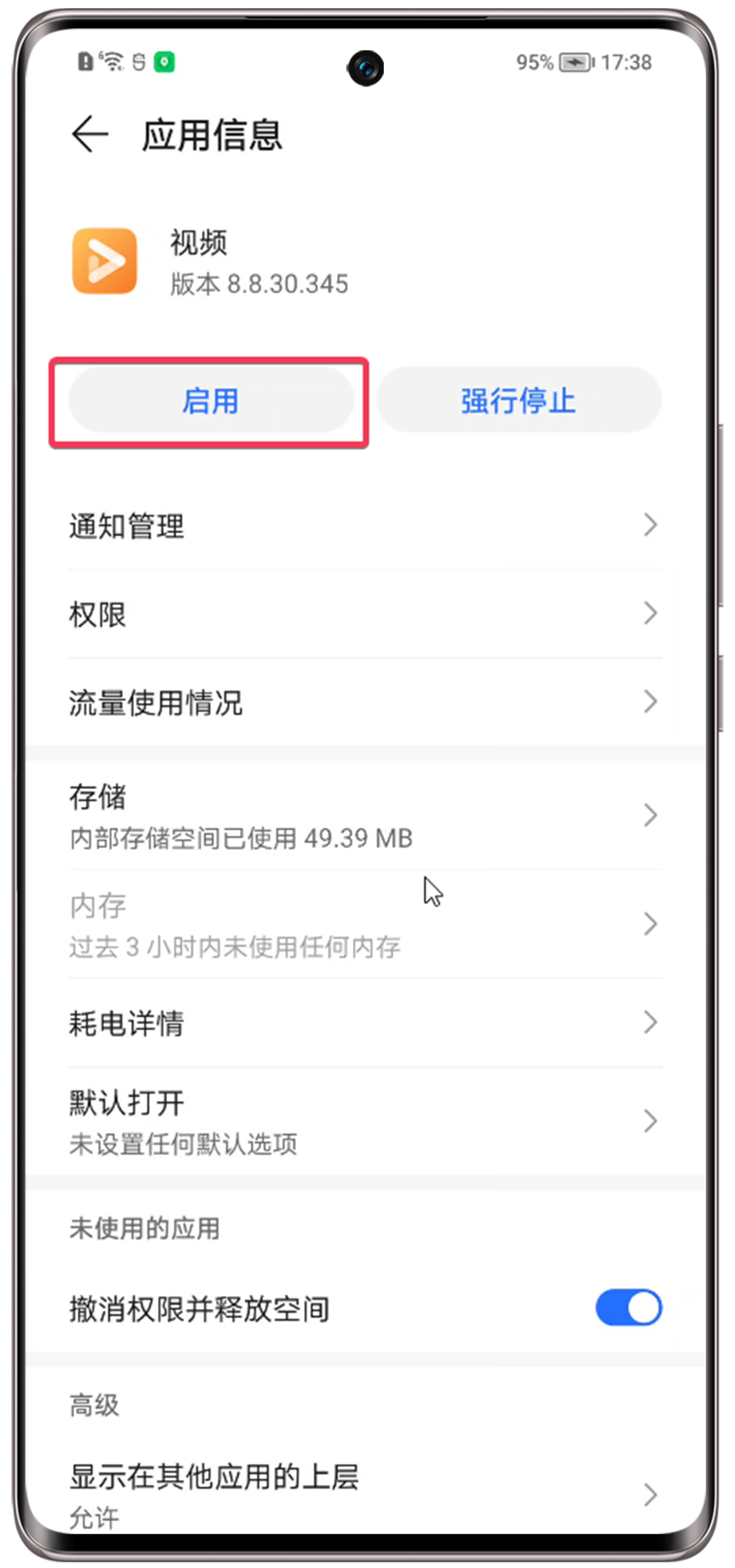请您前往设置>应用>应用管理,搜索“视频”,点击进入后,检查该应用是否已禁用,如果已禁用,点击“启用”即可。