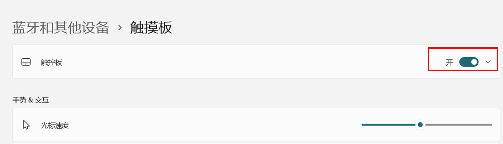 当您禁用触摸板后,您可以同时按下“Win + I”键打开设置窗口,然后通过“Tab”键、上下左右键和“Enter”键进入到“蓝牙和其他设备”中的“触控板”选项中,再通过“Tab”键选中触控板开关后,按空格键即可开启触摸板。