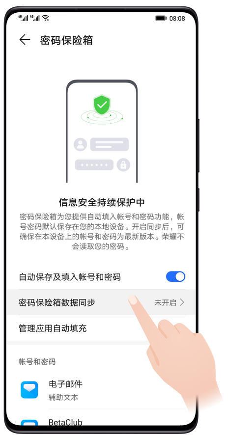 2.点击密码保险箱数据同步,并登录您的荣耀账号以使用数据同步能力。