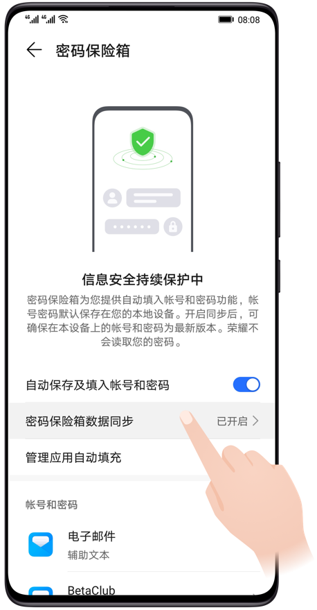 2.点击密码保险箱数据同步,并登录您的荣耀账号以使用数据同步能力。