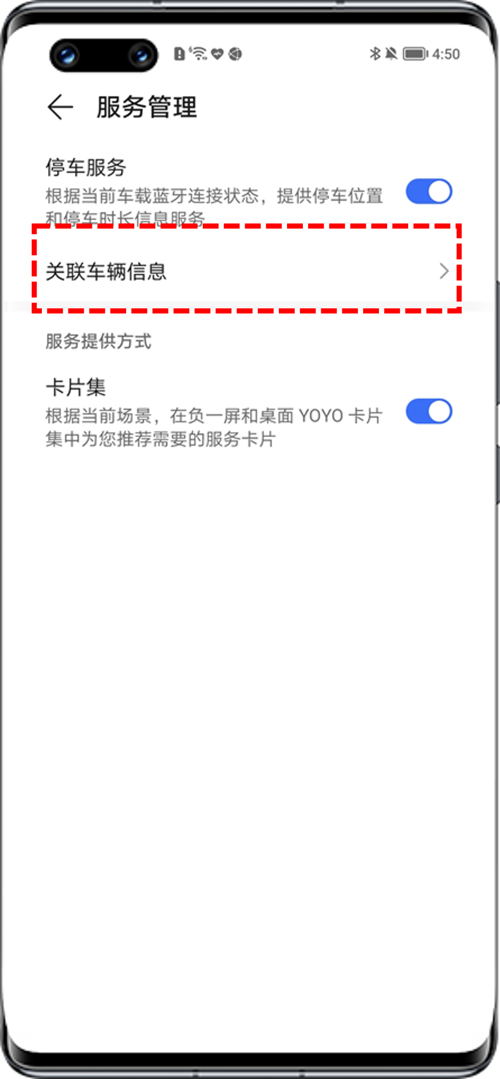 您可以在设置>智慧助手/荣耀AI&YOYO>YOYO建议>停车服务(驾车服务>停车服务)>关联车辆信息,找到相应车辆后进行关联或删除解绑。