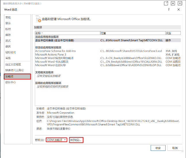 - 如果可以正常打开并且使用,然后点击“文件 > 选项 > 加载项”,在“管理”中选择“COM加载项”,点击“转到”,把加载项前面的勾全部去掉(请勿将加载项删除),然后点击“确定”,重启该 Office 应用,查看问题是否还会出现。