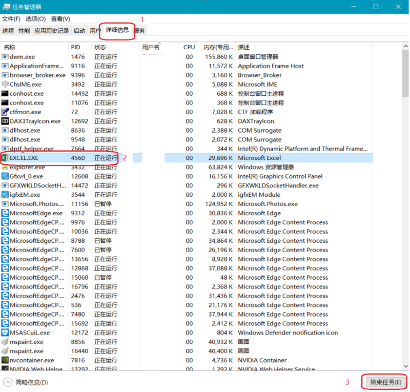 - 在“进程”或“详细信息”选项卡中选择 Office 的应用,然后点击“结束任务”。