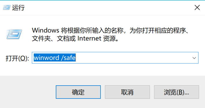 运行 Word 输入“winword /safe”,运行 Excel 输入“excel /safe”,运行 PowerPoint 输入“powerpnt /safe”。字符“/”前注意有“空格”。