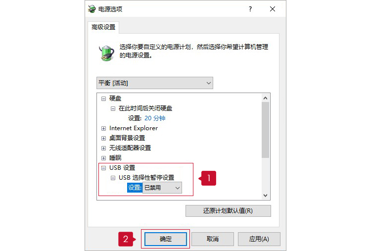 - 依次打开USB设置 > USB选择性暂停设置,然后设置为已禁用,点击确定按钮后,尝试重新插入USB。