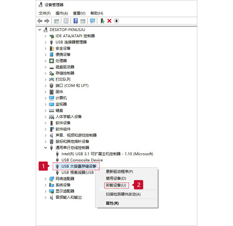 点击设备管理器,选择通用串行总线控制器后点击USB 大容量存储设备,点击卸载设备后重新插入USB设备;