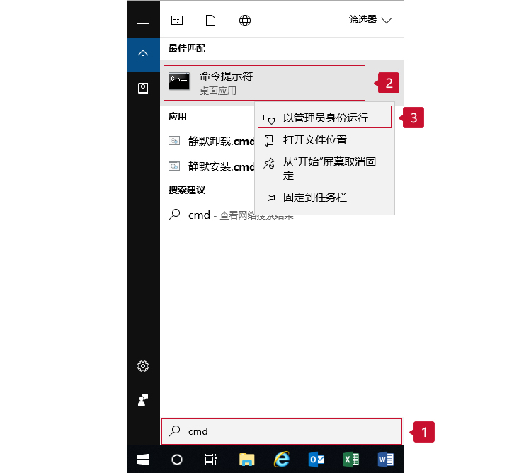 - 在搜索框内输入cmd,在最上方的备选程序图标上右击,选择以管理员身份运行;