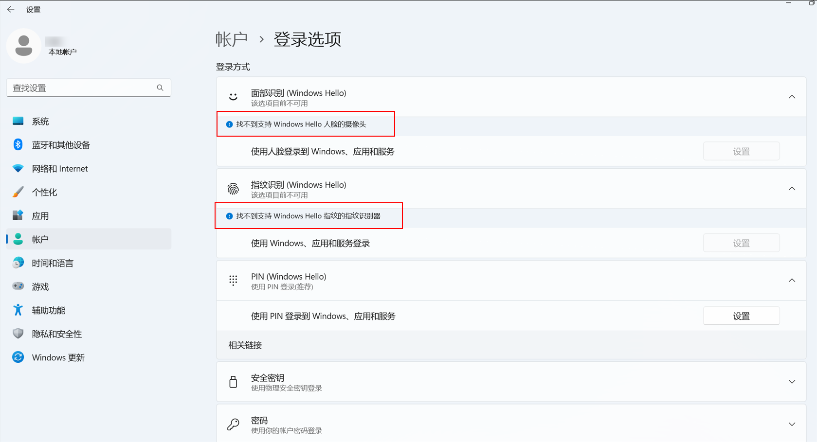 笔记本登录选项页面显示“找不到支持Windows Hello人脸的摄像头/找不到支持Windows Hello指纹的指纹识别器”。